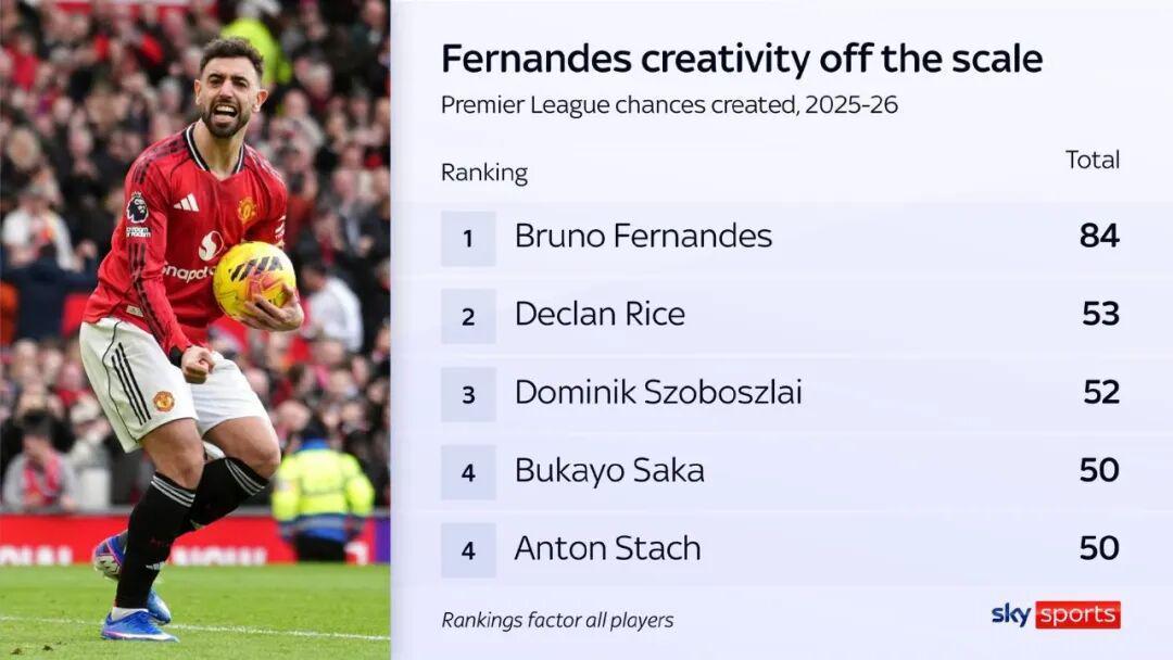 天空体育:B费已创造84次机会,赖斯53次排名第2
